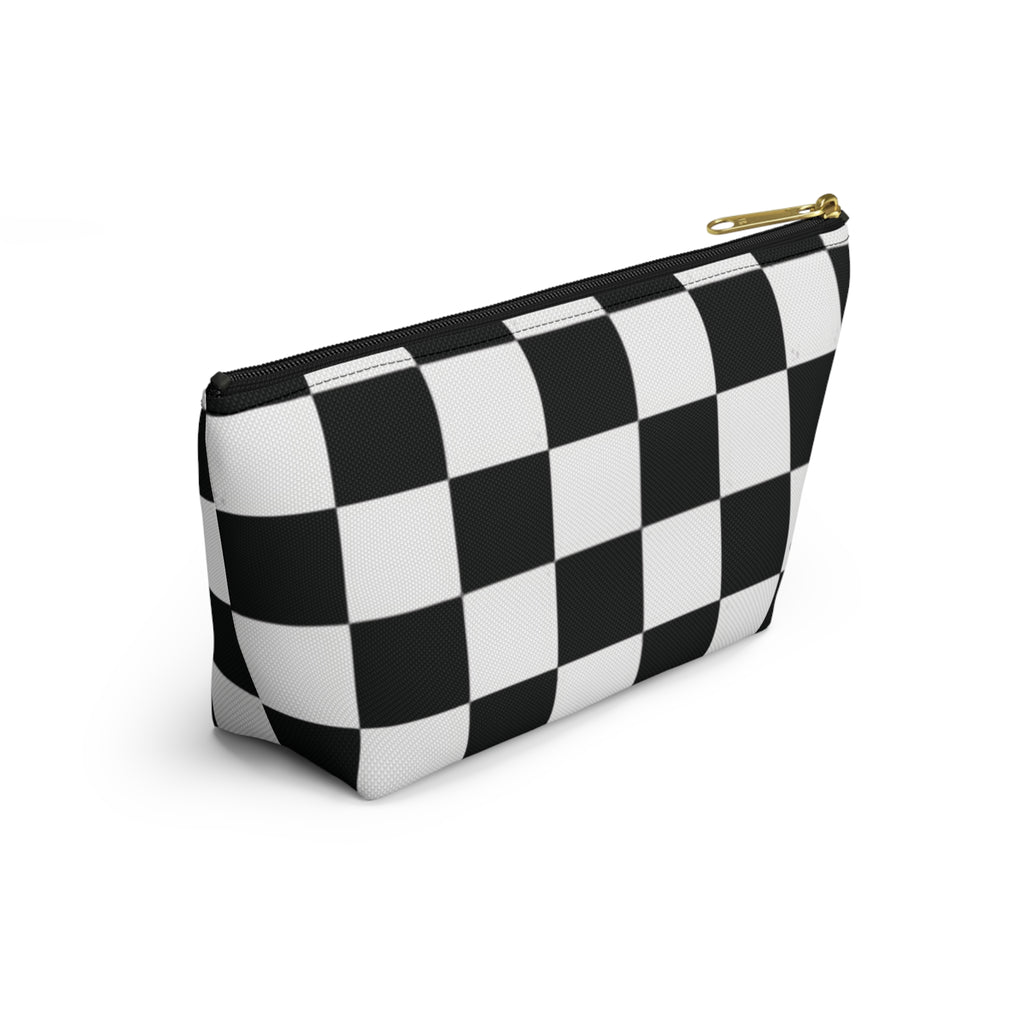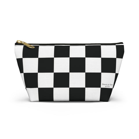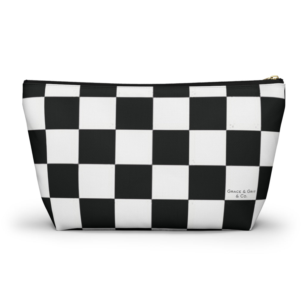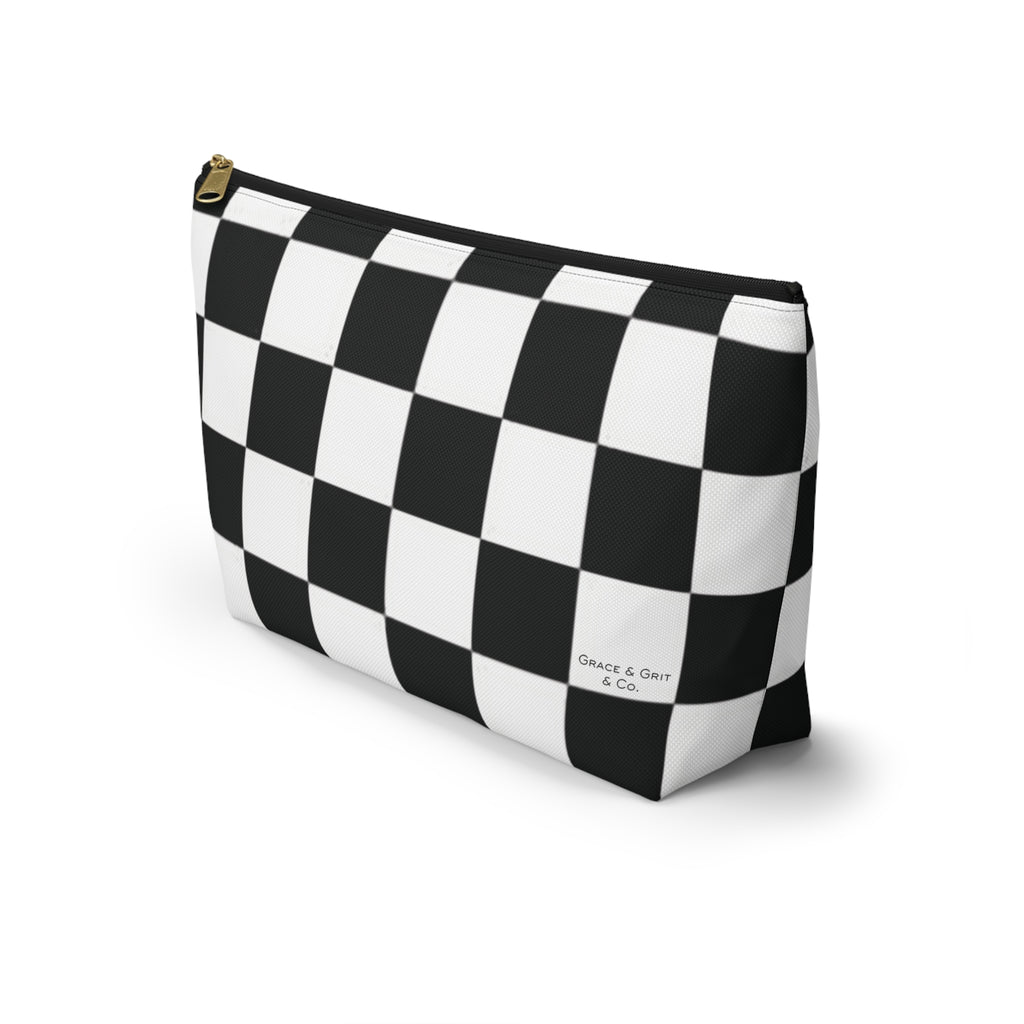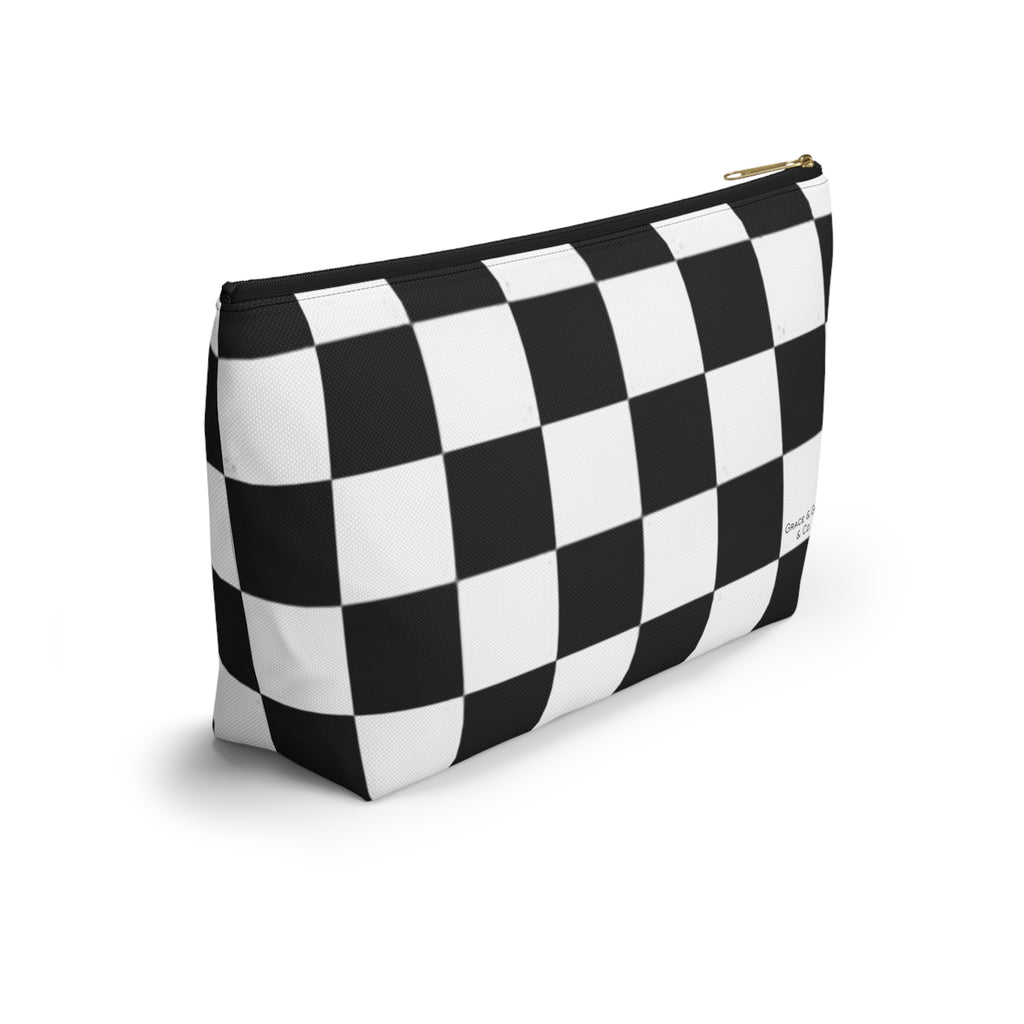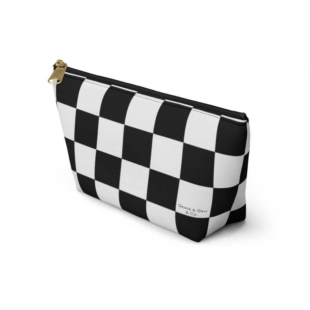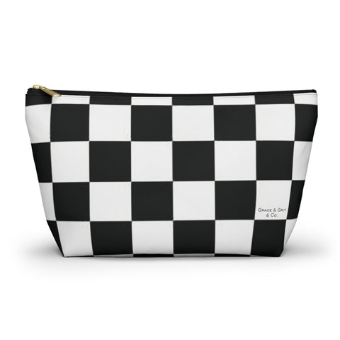Make a statement while bringing your favorite accessories along for the ride. Our Checkerboard Accessory Pouch features 100% spun polyester, non-woven laminate inside, and a gold color zipper pull.